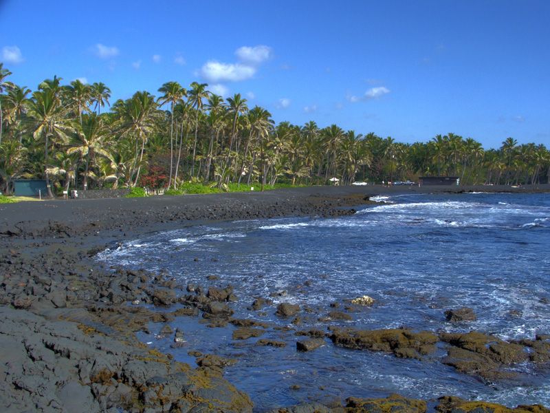 Punaluʻu Beach is a beach between Pāhala and Nāʻālehu on the Big Island of the U.S. state of Hawaii. The beach has black sand made of basalt and created by lava flowing into the ocean which explodes as it reaches the ocean and cools. This volcanic activity is in the Hawaiʻi Volcanoes National Park. Pictures HERE and on Google HERE